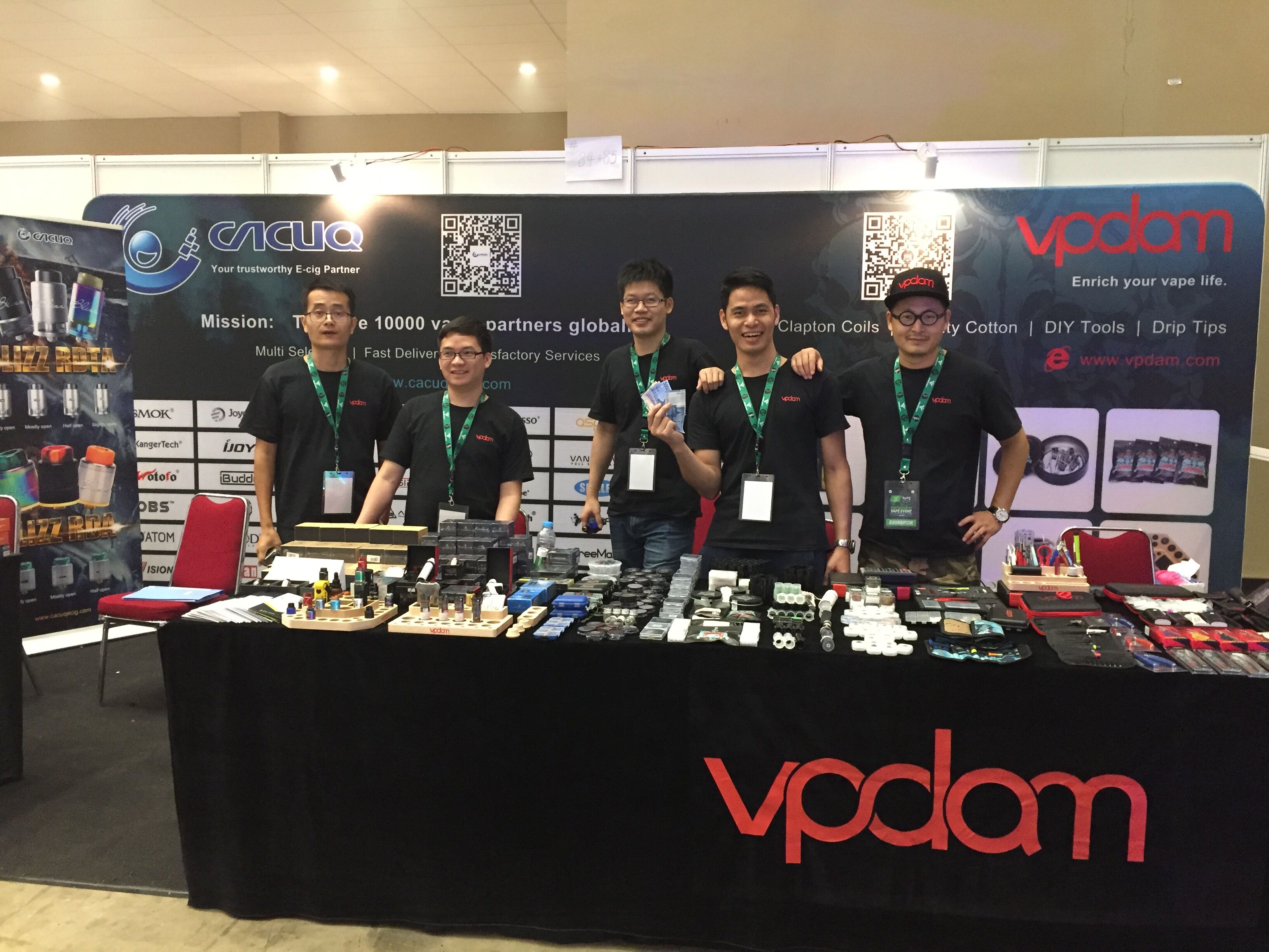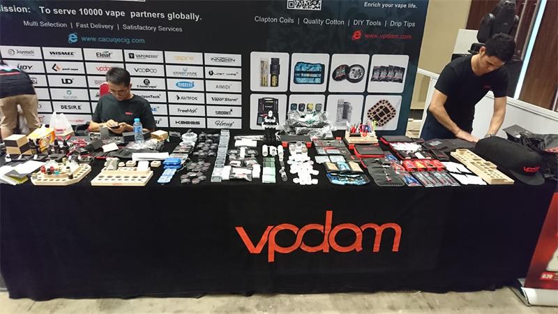 The convention lasted two days, during which almost all important wholesalers made their presence, including Heaven Gifts, Elego, and Coilmaster besides Vpdam and Cacuq. Among all the Chinese wholesalers, Vpdam and Cacuq are by far the most popular, attracting hordes of visitors and producing traffic jams at 11 am each day. Vpdam was the only vendor at the convention with a complete set of vaping accessories.