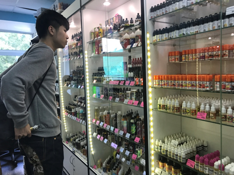A visitor from China was mesmerized by the vast assortment of E-liquids in the booth.