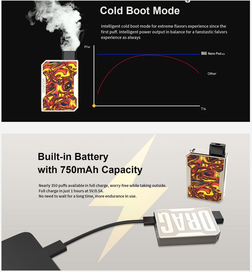 VOOPOO DRAG Nano Pot Kit! As the first pod system kit form VOOPOO DRAG family, the DRAG Nano consists of built-in 750mAh battery and 1.0ml refillable pod with pocket-friendly size with beautiful resin panel.