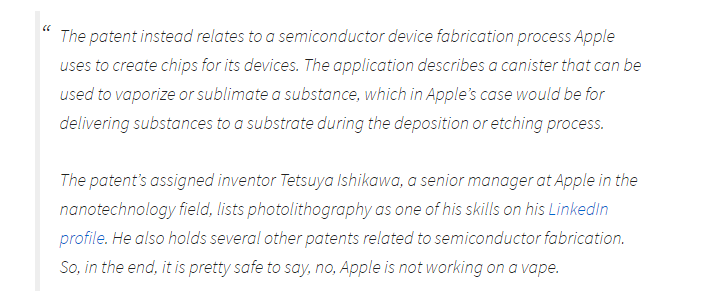 The buzzkills at MacRumors threw cold water on the celebrations. “The patent instead relates to a semiconductor device fabrication process Apple uses to create chips for its devices,” they wrote. “The application describes a canister that can be used to vaporize or sublimate a substance, which in Apple’s case would be for delivering substances to a substrate during the deposition or etching process.“The patent’s assigned inventor Tetsuya Ishikawa, a senior manager at Apple in the nanotechnology field, lists photolithography as one of his skills on his LinkedIn profile. He also holds several other patents related to semiconductor fabrication. So, in the end, it is pretty safe to say, no, Apple is not working on a vape.”