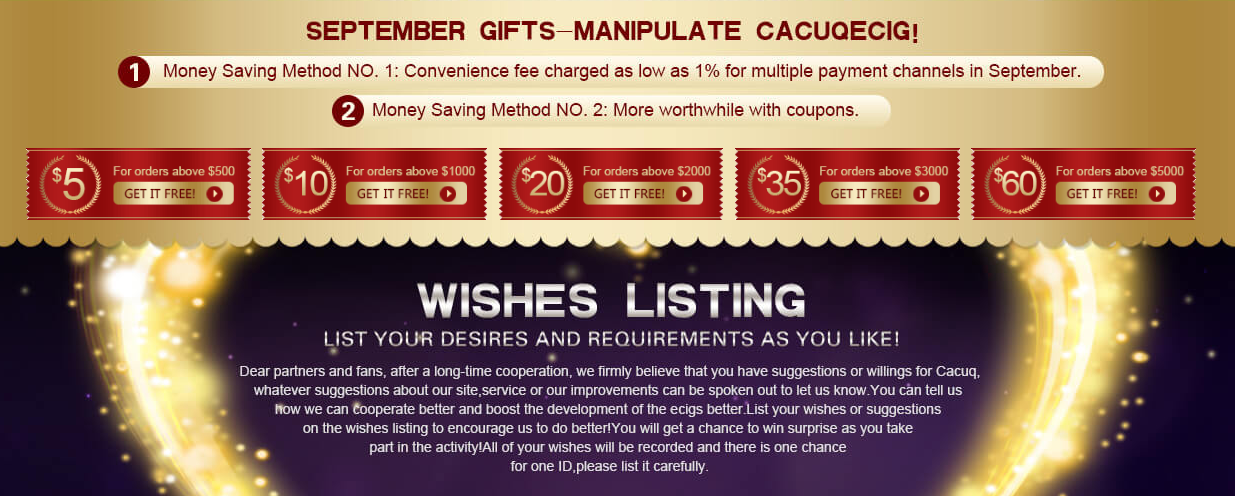 Like every other product, e-cigarettes are also sold through wholesale distributors and Cacuq is obviously one of the best wholesalers. we have a wealth of experience and can give you lots of advice to help you get started, we stock up to more than 1000 kinds of ecigs and e-juice, even the ecigs accessaries, all of which have the authorization from many brandy e-cigs such as Joyetech, Aspire, Eleaf, Hotcig, KangerTech, Smok, Sigelei and other premium E-cig brands products and we can offer you the most competititive prices on many products plus fast next day delivery with all kinds of shipping ways,on the base of cloud data and surveys,which makes sure your price and shipping time is the most suitable.Our main feature exist on the most comprehensive new arrivals+fastest delivery date+best service.Our partnership with the e-cigs giant enterprises made us get the held of the abundant stocks ,besides which,we can also get close to the newest e-cigs industry information.
