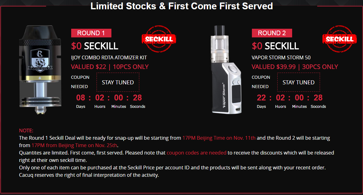 1.The Round 1 Seckill Deal will be ready for snap-up will be starting from 17PM Beijing Time on Nov. 11th and the Round 2 will be starting from 17PM from Beijing Time on Nov. 25th.