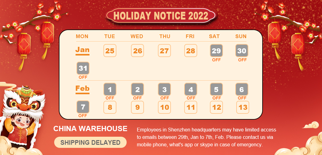 Employees in Shenzhen headquarters may have limited access to emails between 29th, Jan to 7th, Feb. Please contact us via mobile phone, whatsapp or skype in case of emergency.
