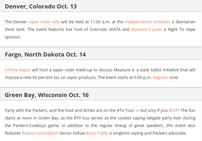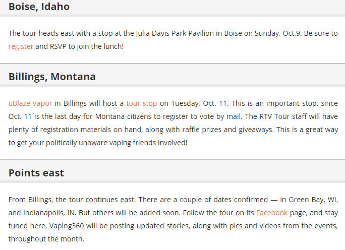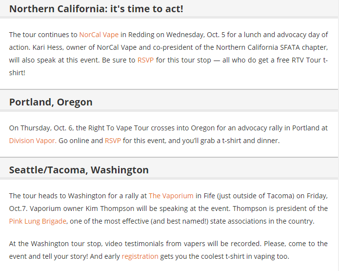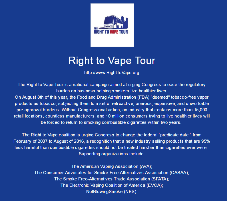 The Cole-Bishop amendment that currently is part of the House Agriculture Appropriations Bill would change the predicate date in the regulations from 2007 to August 8 of this year. That would allow all current products to remain on the market after the 2018 deadline for submitting costly premarket tobacco applications.The first leg of the tour covered Las Vegas, southern and northern California, Oregon, Washington and Boise, Idaho. The team released the first installment of a video documentary about the tour, featuring film from some of the events and interviews with the principals, as well as vapers and other vaping advocates.And beyond...