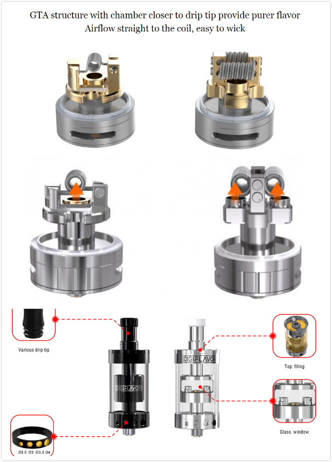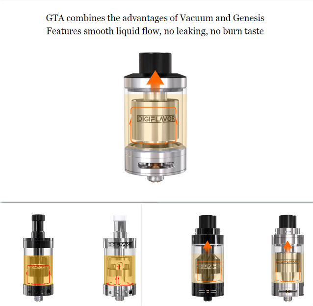 GTA structure with chamber closer to drip tip provide purer flavor. Airflow straight to the coil, easy to wick, combining the advantages of Vacuum and Genesis. Features smooth liquid flow, no leaking, no burn taste.