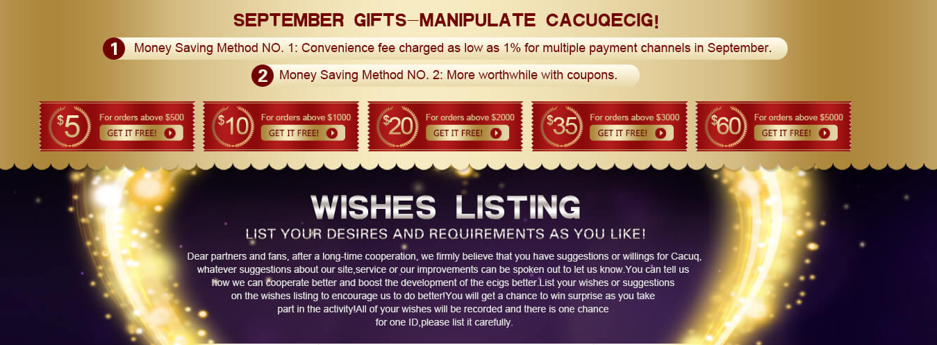 Dear partners and fans, after a long-time cooperation, we firmly believe that you have suggestions or willings for Cacuq,whatever suggestions about our site,service or our improvements can be spoken out to let us know.You can tell us how we can cooperate better and boost the development of the ecigs better.List your wishes or suggestions on the wishes listing to encourage us to do better!You will get a chance to win surprise as you take part in the activity!(One chance for one ID)