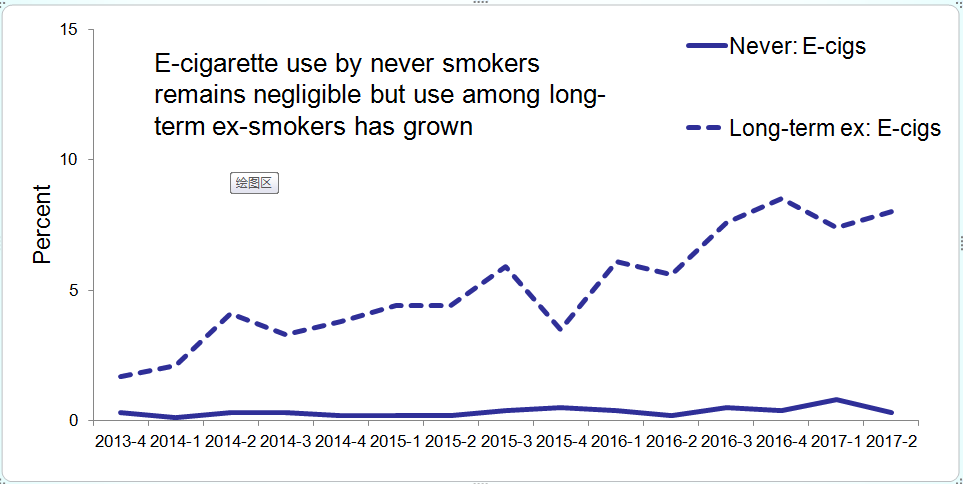 As we can see from the graph, Electronic Cigarette use by never smokers remains negligible but use among long-term ex-smokers has grown since 2013, though moderately.