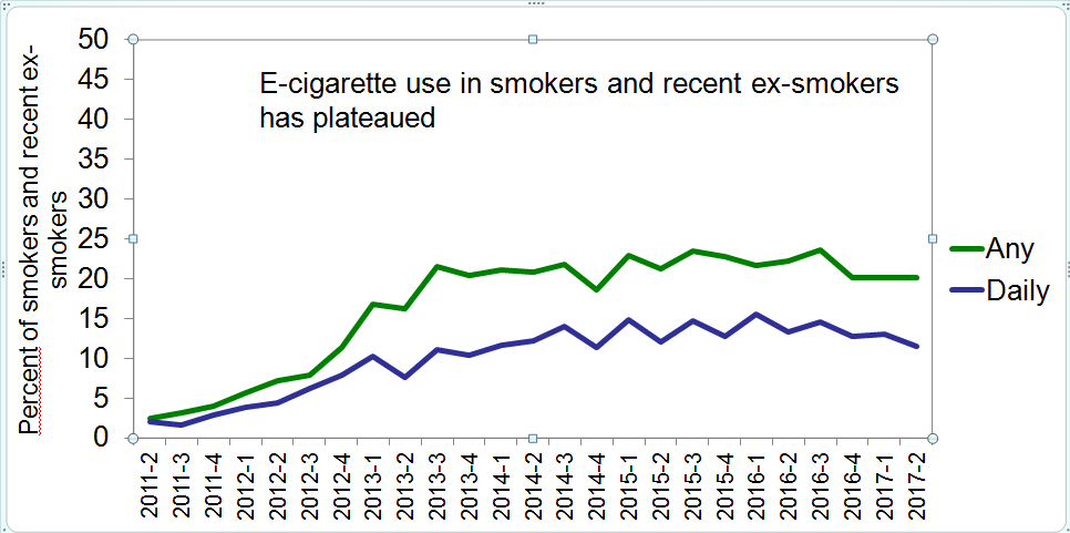 The graph tells us that Electronic Cigarette use in smokers and recent ex-smokers has plateaued since 2013 after substantial increases from 2011 to 2013.
