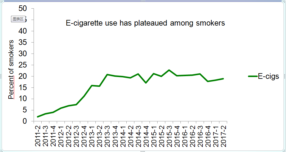 According to the three graphs above, we may easily observe that, although there have been more long-term ex-smokers who became Electronic Cigarette users, the use of Electronic Cigarettes among smokers and recent ex-smokers remained stable since 2013. Contrary to public perception, the Electronic Cigarette boom has long ceased to be. This is confirmed by the graph below: