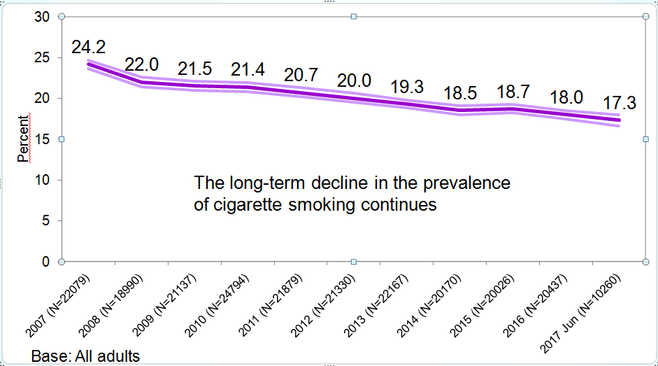 The graph tells us that E-cigarette use has plateaued among smokers. Factoring in the consistent decline in cigarette smoking prevalence as demonstrated by the graph below, we may safely conclude, though without conventional data analysis, that Electronic Cigarette use among all groups (except long-term ex-smokers, the growth of prevalence among which is insubstantial) has remained stable.