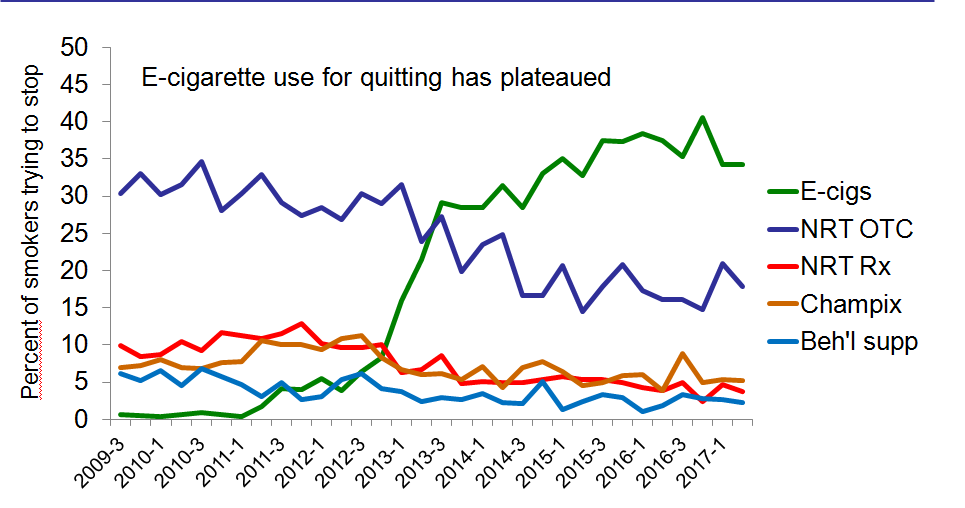 As we can see from the graph, E-cigarette use for quitting has plateaued since 2013. Also, something not to be overlooked is that, prior to 2011, the year when Electronic Cigarette started its ascension, the prevalence of NRT OTC was at almost as high as that of E-cig in present day. Although popularity of NRT OTC has since plummeted with the rise of Electronic Cigarettes, it is still a force to be reckoned with, 20% of adults who smoke and tried to stop or who stopped in the past year still using NRT OTC as their aid---a figure not to be slighted. It is also not clear whether the declining prevalence of NRT OTC is caused by the increasing prevalence of Electronic Cigarettes, as we only see from the graph a conjunction of these two trends, but not causality. But this graph does tell us that, since 2011, there has been a large proportion of smokers who try to stop smoking that employ Electronic Cigarettes as their means of quitting.