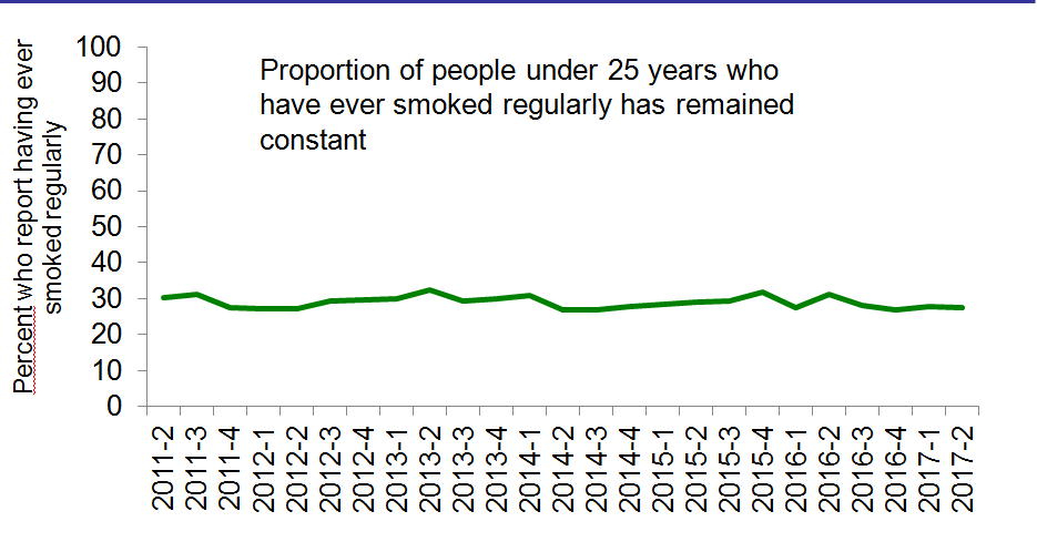 Take a look at the graph below which shows that the proportion of people under 25 years who have ever smoked regularly has remained constant.