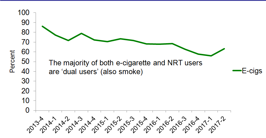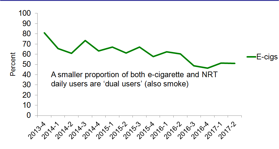 It is also clear that from 2013 to 2017, the amount of dual users reduced moderately in proportion. Considering the fact that the number of Electronic Cigarette users remained stable since 2013, we may infer that the number of dual users reduced roughly by one-third as seen in both the graphs above. Not considering other factors that may have played a role in this reduction, it may, judging from the above graphs alone, seem reasonable to conclude that Electronic Cigarettes do help smokers quit. But again, the reduction maybe due to the exit of Electronic Cigarette using by dual users while the new entries are people who already quitted smoking. Therefore it is not clear from these two graphs whether Electronic Cigarettes can really help smokers quit.