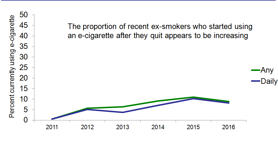 This shows that the proportion of recent ex-smokers who started using an e-cigarette after they quit appears to be increasing. Note that these adults are those who in the past year succeeded in quitting smoking and did not report using an E-cigarette to help during the quit attempt. We have to observe that only less than ten percent of the adults who quitted smoking in the past year are currently E-cigarette users, which casts a serious shadow upon the argument that that they employed Electronic Cigarette as a means to fortify their achievement.