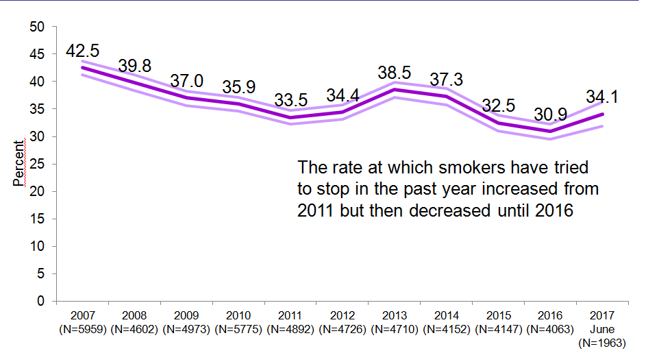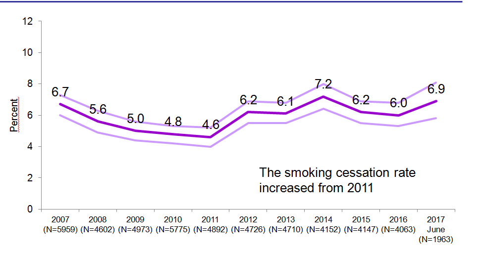 As we can read from the first graph, the smoking cessation rate increased since 2011. This coincided with the increase of the prevalence of use of electronic Cigarettes, but the trajectories for smoking cessation and quit success differ from that of prevalence of use of e-cigarettes. The proportion of smokers who have tried to stop in the past year increased from 2011 but then decreased until 2016. This different trajectory also does not support the argument that the use of Electronic Cigarettes helped smokers quit.
