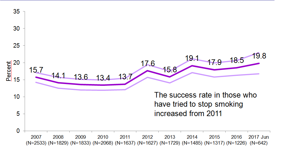 The graph shows that the success rate in those who have tried to stop smoking increased from 2011. But again, the trajectory do not agree with that of the prevalence of the use of Electronic Cigarettes. Therefore the best that could be concluded is that there is a conjunction of these two events, as we have seen from the analysis of all the other graphs in this article, but not causality.