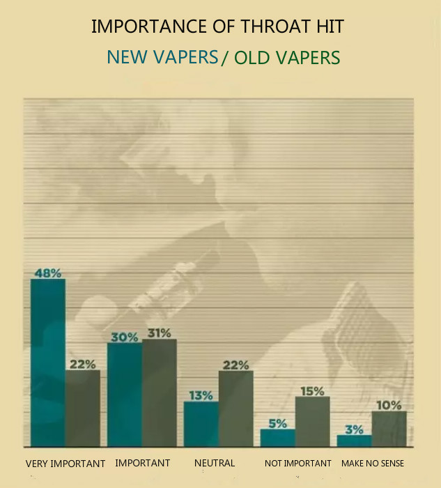 We can take this in another words, that is to say, if you are in no pursue of throat hit, you can not only quit smoking but also quit vaping. So we can see that firstly, you vape for the sake of finding the cigarette succedaneum and after a long time of vaping , you will gradually get ride of the addict to nicotine, so only 53% regard the throat hit as important.