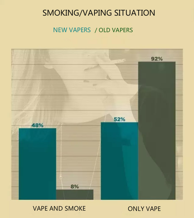 The results found that as for those novice, the one only vape and the other both vape and smoke take up almost the same proportion of taking up half of the number while after a long time’s vaping , the proportion of both vaping and smoking only takes up 8% and all the rest old vapers only vape.