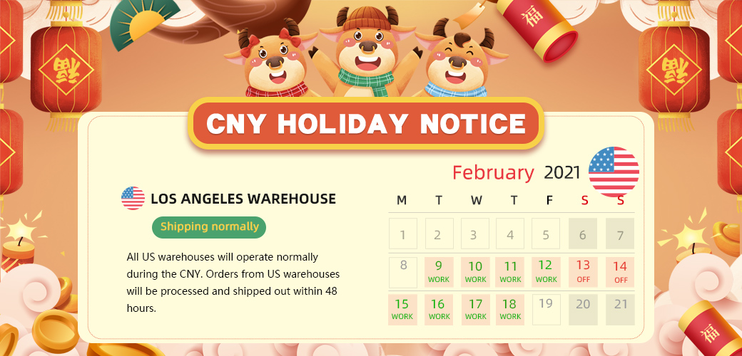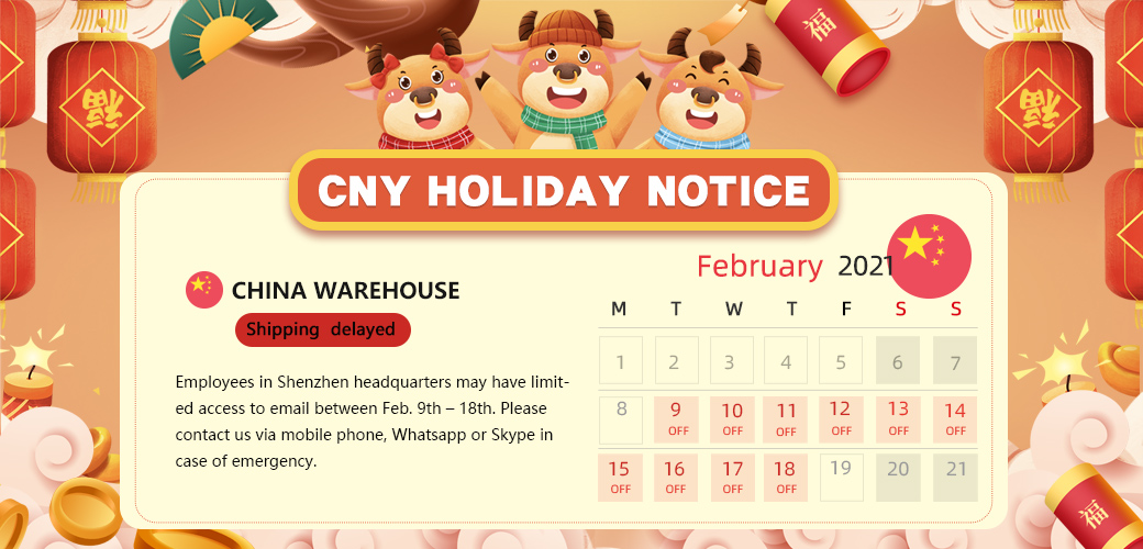 Manufacturing and shipping may be delayed during the Chinese Spring Festival. Please refer the following calendar to plan your ordering/shipping.