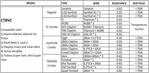 CTBVC Compatible with:Aspire Atlantis, Atlantis V2, Triton;Eleaf Melo 2, iJust 2;Playboy Vixen and Vixen Mini;Sense Herakles;Tobeco Super Tank, Mini Super Tank.