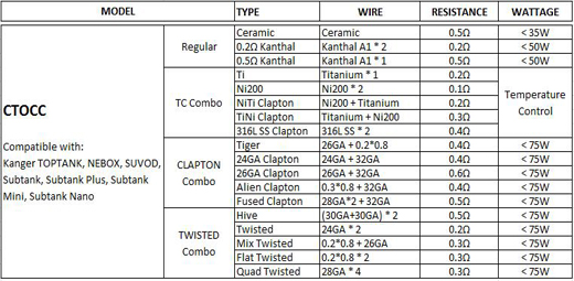 CTOCC Compatible with:Kanger TOPTANK, NEBOX, SUVOD, Subtank, Subtank Plus, Subtank Mini, Subtank Nano.