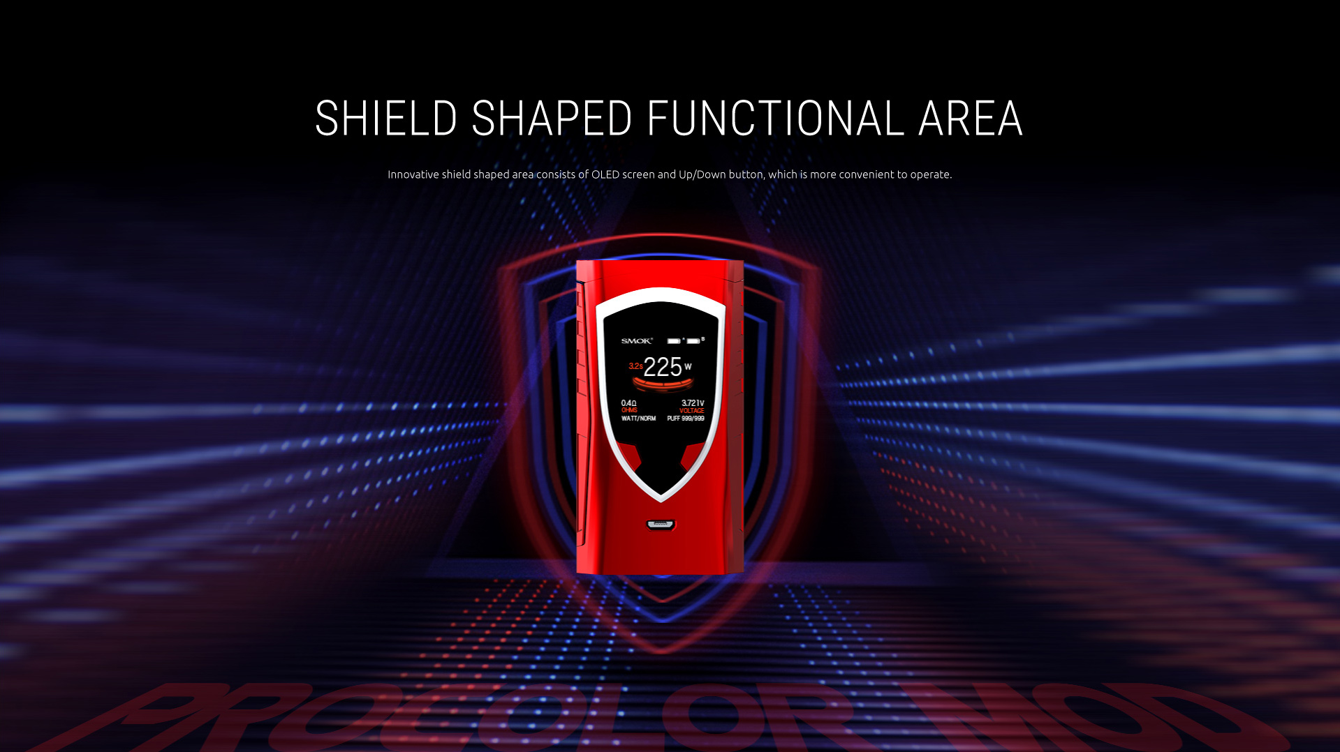 ProColor Mod has a shield-shaped RGB backlight area in which are installed Up/Down buttons and a high definition 1.3 inch OLED screen, on which is displayed a responsive, attractive, efficient, familiar, concise, and consistent user interface on which all important indicators are clearly exhibited and different modes easily switched among. There are 6 colors available to set as screen background, improving the monotony of display design and bringing more enjoyment of sheer novelty.