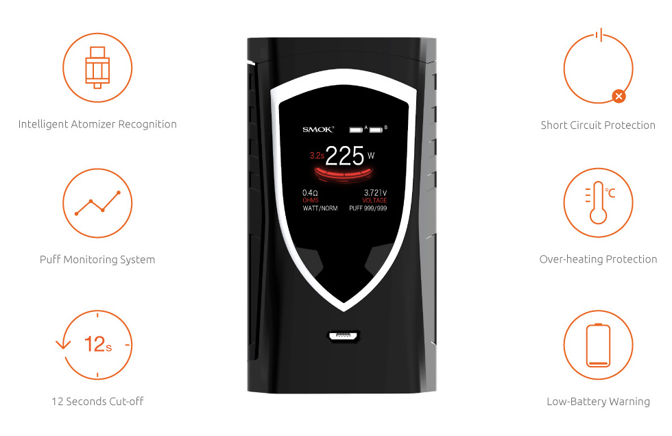 Besides the above mentioned, the following features are developed and installed in the system which are essential to safe and intelligent vaping, including Intelligent Atomizer Recognition, Puff Monitoring System, 12 Seconds Cut-off, Short Circuit Protection, Over-heating Protection, and Low-battery.
