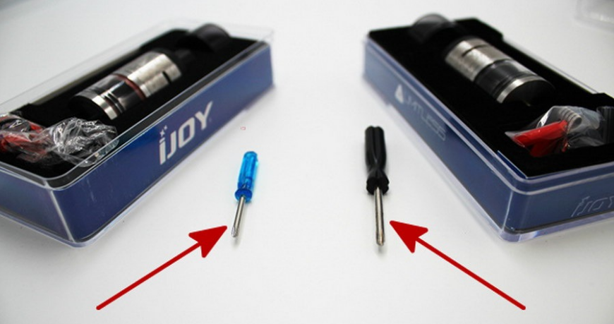Right side:the genuine screw driver is moulded by IJOY, the handle is easy to take and the size is bigger than the fake one.