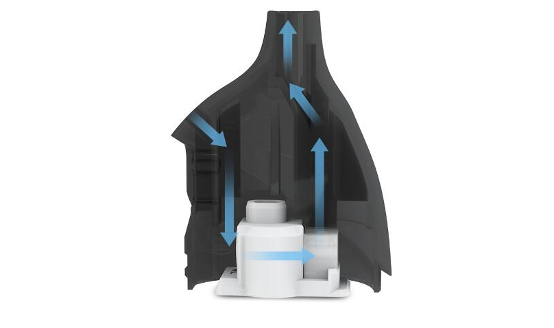 A ceramic cradle, right on top of the cartridge, and walled by the outer frame, directs the inflow air from the ventilation hole to the drip tip and causes it to pass through the cartridge horizontally. The vapor, after loitering and musing in the cradle for some time, is fully mixed and condensed before being inhaled, thereby considerably improving flavor and cloud-producing