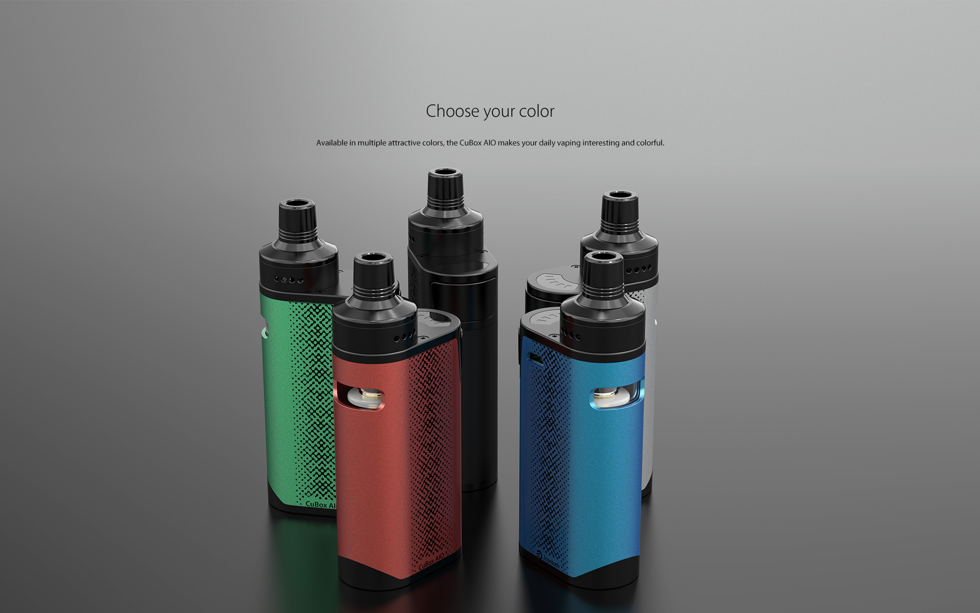 Constructed in all-in-one style, the Joyetech CuBox AIO Starter Kit skillfully and tastefully integrates a 2000mAh built-in battery and the tank into one unified and elegant piece which is exquisitely designed, exhibiting exceptional visual excellence and dignity. Five colors are available, including blue, green, red, silver, and black.
