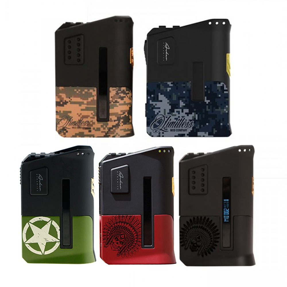 The Limitless Arms Race is the newest edition to the Limitless Family. Going against the herd mentality prevailing in Mod design, the Arms Race Mod is nothing like those elegant, fancy, soft lady Mods that pervade the market. Rugged, masculine, and aggressive, the Arms Race Mod features a proprietary chip set capable of firing up to 200 W with a sophisticated temperature configuration with native support for Ni200 Nickel, Titanium, and Stainless Steel heating elements. The chassis design allows users to slide off the bottom to access the internal battery bays, making battery loading effortless as well as fun.Five colors are available, including green, black, red, desert Digi Camo, blue Digi Camo.