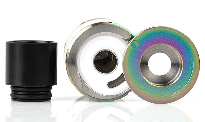The atomizer features a 5ml tank capacity, making sure of an undisrupted continuance of vaping enjoyment. The airflow is exceptional, featuring two large air slots which, upon being adjusted, changes the amount inward airflow allowed, delivering intense flavor when in restriction and massive clouds when fully open.