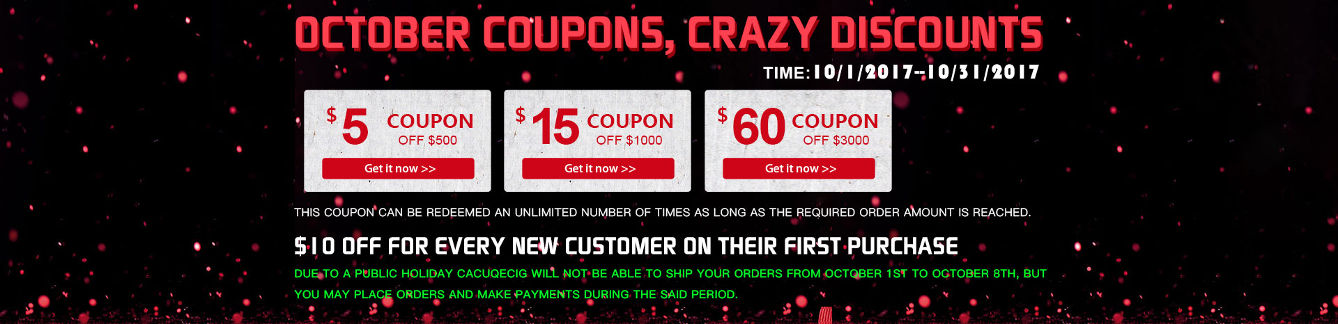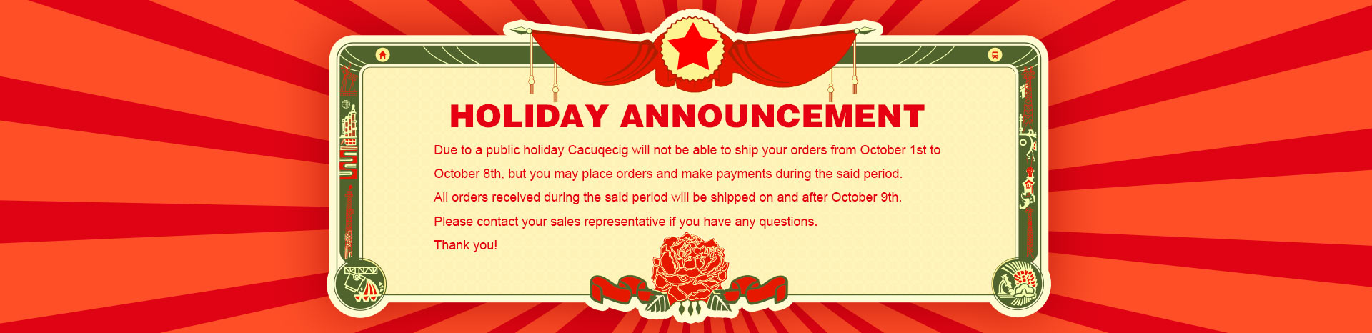 Due to a public holiday Cacuqecig will not be able to ship your orders from October 1st to October 8th, but you may place orders and make payments during the said period.