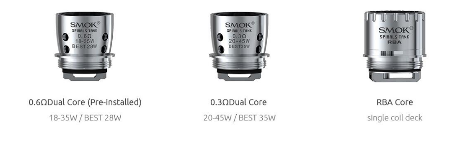 The atomizers induces a taste whirlwind experience, with the included 0.6ohm Spirals Coil featuring a wattage range of 18 to 35W with a recommended output of 18W. The package also includes a 0.3ohm Spirals Coil along with a single-coil RBA Coil Head for optional rebuildable capability. Built with streamlined designs with a versatile flavor-oriented platform, the SMOKTech Spirals Sub-Ohm Tank is a highly desirable system.