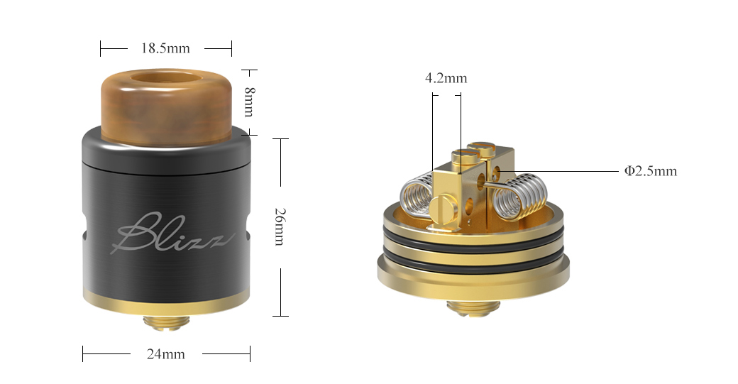Constructed from top-grade bronze, the Blizz RDA ensures maximum conductivity, the stability of which, together with its spacious building deck, steady post, and strong screws constitutes some of the major reasons why it has become one of the most sought-after RDAs in the market. It's gold-plated 510 pin, without being excessively decorative, is a master stroke of transforming the icing on the cake into an indispensable part of the whole, producing a balanced and consistent impression of the entire unit.