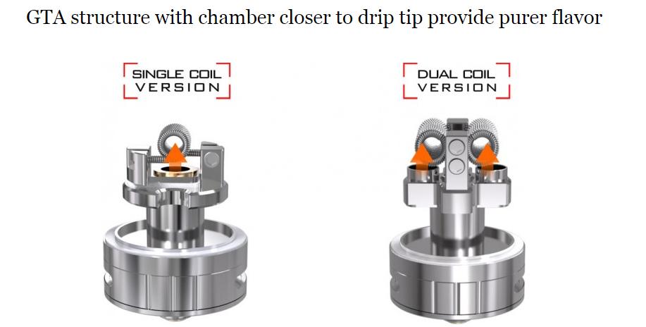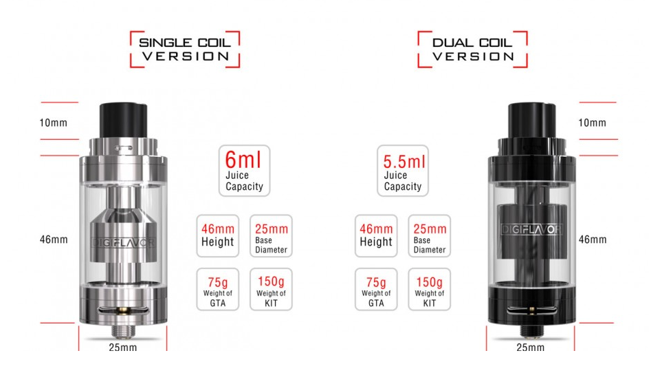 The Dual-Coil Version implements Velocity-inspired two-post, dual terminal design, allowing for efficient use of space while accommodating large coil structures and exotic configurations.The Dual coil version Fuji GTA features 5.5ml E-liquid capacity. The GTA structure with chamber closer to drip tip will provide purer flavor. The airflow straight to coil, easy to wick. The GTA combines the advantages of Vacuum and Genesis. The dual coil version features a dual terminal per post design, with each terminal measuring 3mm by 2mm and dual 5mm diameter airholes feeding into the chamber.This Digiflavor Fuji GTA is a great design for flavor enthusiasts!