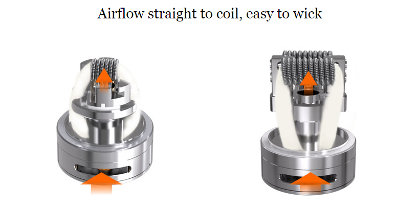 The Single-Coil Version build deck is specifically designed to accommodate single coil configurations, with an enlarged 4.5mm internal airflow built directly below the unique two-post open-style chamber where coils are laid into the terminal rather than threaded through a hole, secured horizontally via side-tensioned (similar to Serpent Mini RTA).Designed to meet the demands of an all day level atomizer, the single coil version and dual coil versions of the Fuji hold 6ml and 5.5ml respectively. Each version deploys a two post build deck, with the single coil version utilizing a shelf style terminal design with an coil mounting space of 2mm by 3mm per post, and is fed by a centrally positioned 5mm airhole.