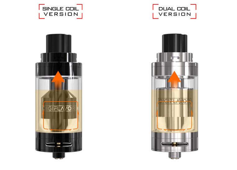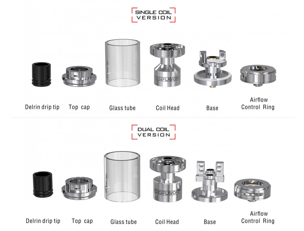 The build deck for the single coil version Fuji GTA is designed to fasten down your coil in the center of the deck to provide a straight shot from the airflow chamber through the coil and to the mouthpiece. The Fuji GTA's raised build deck (located in the middle of the tank) shortens the distance between the coils and the drip tip. All of these features along with a reduced chamber size are in line with the DigiFlavor brand vision to offer best flavor in the vape game!
