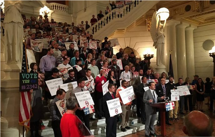 Vapers and vendors made some noise in Pennsylvania Monday, filling the steps of the capitol in Harrisburg. The protest of the 40 percent tax was well organized and orderly. Depending on who you ask, there were between 250 and 400 protesters.Speaker after speaker decried the unjust tax, and asked the legislature to pass the compromise bill (HB 2342) offered by Rep. Jeff Wheeland, which replaces the 40 percent tax with a five-cents-per-milliliter e-liquid tax. While no tax on vapor products is a good thing, the Wheeland bill also eliminates the criminal penalties for vapers who buy from unlicensed sellers.